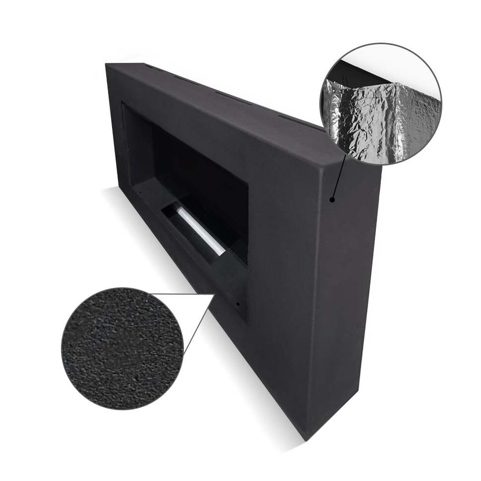 Очаг биокамина покрыт огнеупорной порошковой краской. При необходимости рекомендуем покрыть обратную часть очага теплоизоляцией!