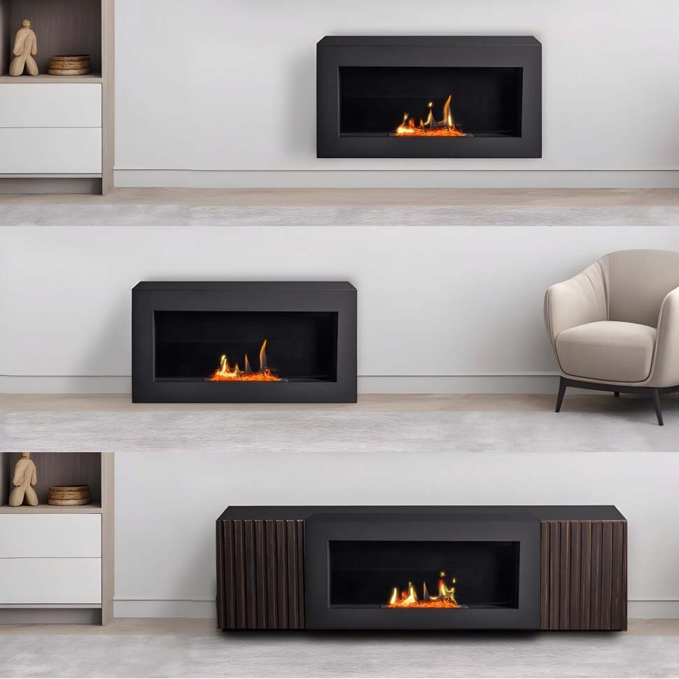 Разместить камин можно на полу, на стене или мебели. На обратной стороне очага есть специальные отверстия для навеса.