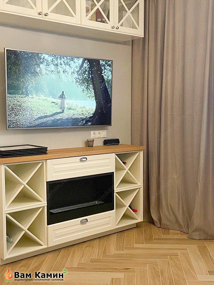 Одно из основных преимуществ биокаминов - компактные размеры дают возможность устанавливать их в стены, ниши и предметы мебели. В данном случае мы можем видеть экокамин, который встроили в красивую тумбу с винными полками. Тумба традиционно расположена под ТВ-экраном, поэтому можно с комфортом смотреть любимые фильмы в тепле и уюте. Такой биокамин создавался компанией SteelHeat на заказ по размерам клиента.