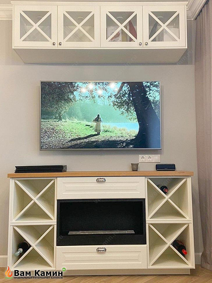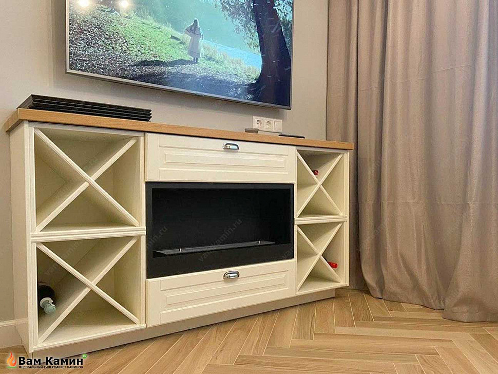 Биокамин в тумбе с винными полками